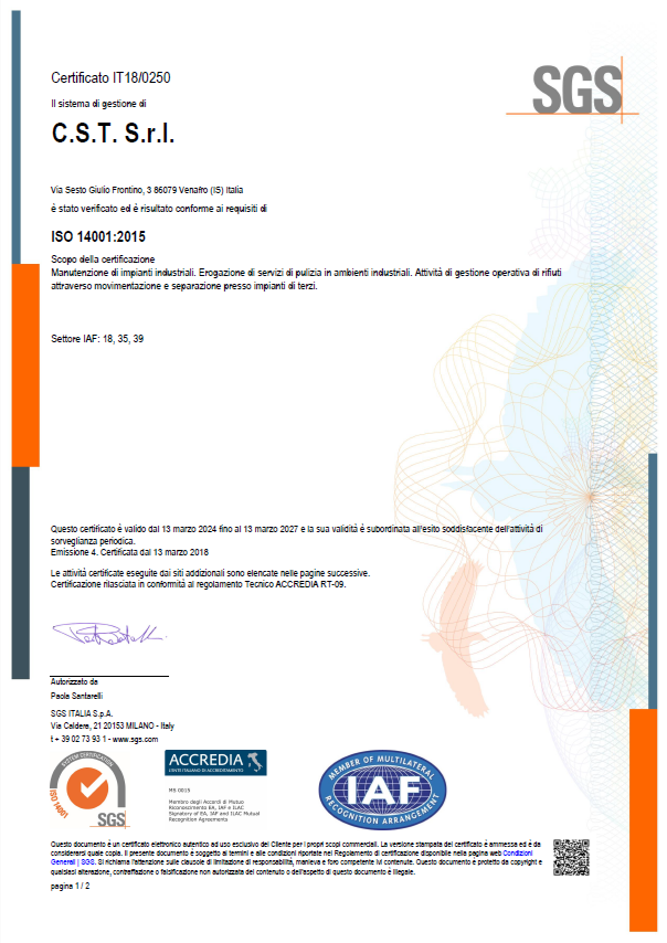 La certificazione ISO 14001 attesta che operiamo nel rispetto delle normative ambientali e con un sistema strutturato di monitoraggio e miglioramento.